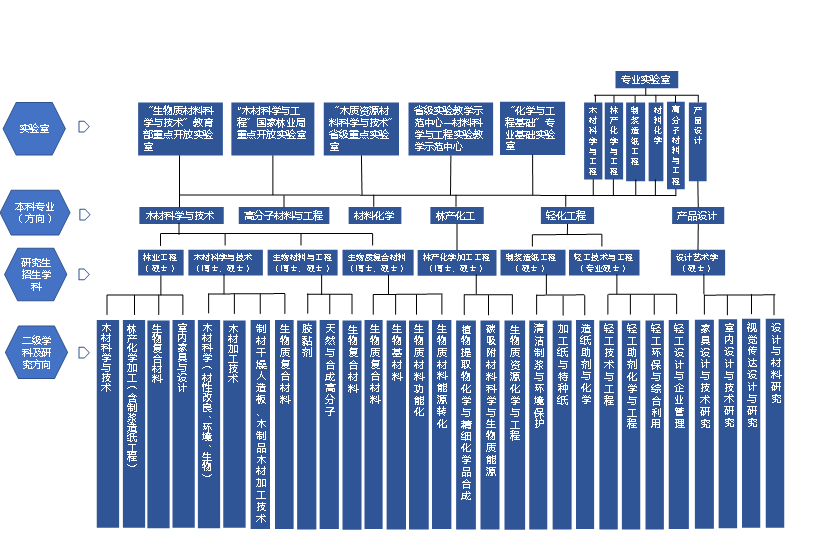 拥有“林业工程”国家一级重点学科(在过去十五年的国家学科评审中均名列全国同类学科第一),“木材科学与技术”、“林产化学加工工程”两个国家二级重点学科,“生物材料工程”省级重点学科,“生物质复合材料”学科、“设计艺术学”学科和“制浆造纸工程”学科,并接收培养外国留学生。学院紧密结合科技发展和生产实际需要,瞄准学科前沿,促进跨学科、多领域的交叉融合,建立以林业工程为优势,“木材科学与技术”和“林产化学加工工程”为特色的优势学科群,形成了本科、硕士、博士、博士后多层次人才培养格局。