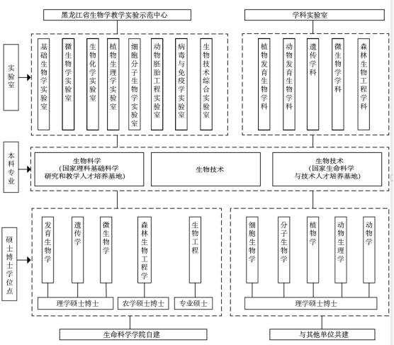 生物学一级学科为黑龙江省重点学科,下设9个博士点,10个硕士点(其中5个学位点共建),覆盖到所有本科专业。