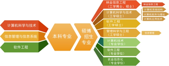 学院现有国家级重点学科林业工程下设的“林业信息工程”二级博士点学科,“计算机科学与技术”和“软件工程”2个一级硕士点学科;“林业信息工程”、“软件工程”、“计算机系统结构”、“计算机软件与理论”、“计算机应用技术”、“管理科学与工程”等科学学位,以及“计算机技术”、“软件工程”、“农业信息化”专业学位共9个全日制硕士学位授权点。博士和硕士学位授权点覆盖学院所有本科专业。每年有12%左右的本科生可免试攻读本校及其它院校硕士学位或直接攻读博士学位。