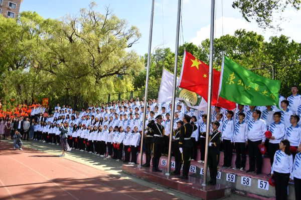 在雄壮的国歌声中,国旗、校旗和运动会会旗冉冉升起。